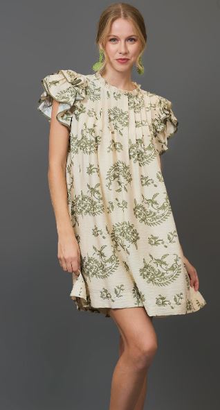 This pretty dress has a ruffle cap sleeve with contrast edge and a pleated front detail and comes above the knee and is lined